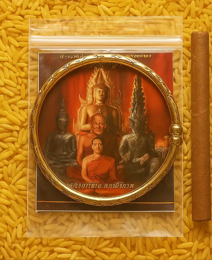 Gelang karya Phra Arjarn O (Phetchabun) ini memadukan abu krematorium sembilan jutawan Tionghoa, logam suci 10 000 lempeng doa, dan 100 000 aksara mantra pembuatan Buddha utama. Diyakini sebagai “gelang magnet kekayaan”:
